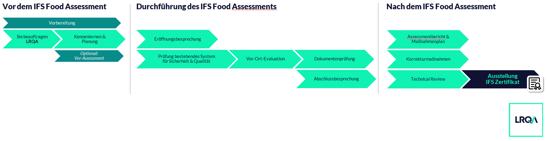 Der Zertifizierungsprozess für IFS Food gliedert sich bei LRQA grundsätzlich in drei Phasen. Die Vorbereitungs- und die Durchführungsphase sowie das abschließende Review.