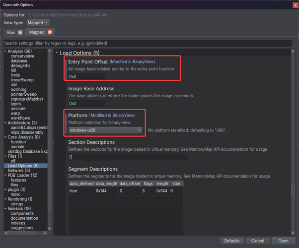 The first step is of course to perform whatever analysis we can in Binary Ninja. This post will be using version 4.3.6507-dev. We’ll start by opening the shellcode, and as it is not a recognisable file format we are presented with the ‘Open with Options’ dialog. We know the shellcode is executed from the start, so the entry offset is just set to 0, and we know the platform is Windows x86 so we’ll set that.