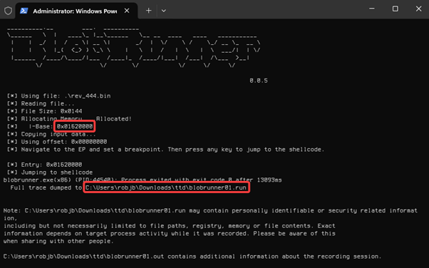 .\TTD.exe .\blobrunner.exe .\rev_444.bin