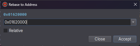 The first step is to rebase our shellcode in Binary Ninja to match the offset that it was run using BlobRunner. In this case, 0x01620000. We can do this by opening the command palette with Ctrl-P and then typing "rebase" and entering this value.