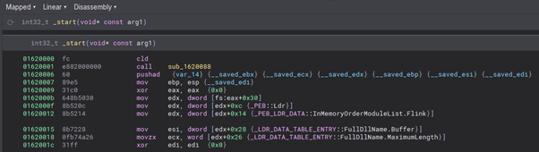 After analysis completes, we are then presented with the start of the shellcode. Binary Ninja has already helpfully set some types, such as the PEB.