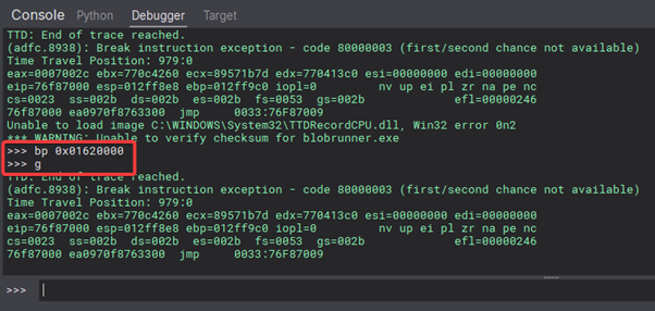 We’ll set a breakpoint on the start of our shellcode with bp 0x01620000 and then enter g to start running, and we then hit our shellcode!