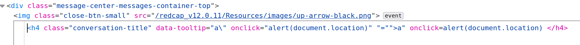REDCap has a built in messenger function which allows all registered users to communicate within the application. Each conversation created has a title which can only be edited by the user which originally created the conversation. The input field where this title can be edited does not filter input and as a result, it is possible to inject malicious JavaScript and HTML.